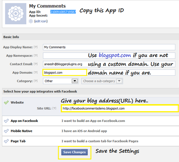 In the App Domain Field give blogspot.com (If you are using a custom domain give that) Give your Blog Address in the Site URL field under “Website” and Save The Changes. Copy the Application ID from the screen